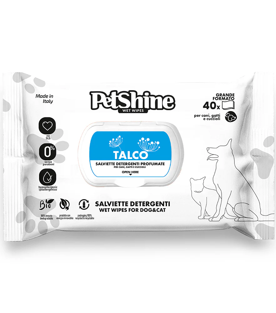 Le salviettine PetShine al talco detergono e deodorano delicatamente cani e gatti. Senza alcool, profumate e adatte all’uso quotidiano, lasciano il pelo morbido e fresco. Confezione da 40 salviette.