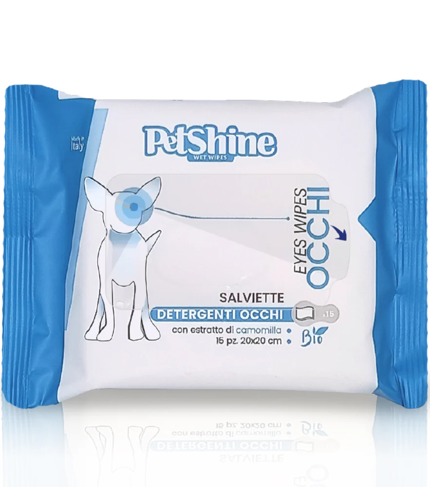 Salviettine PetShine Occhi Pocket con camomilla: detergono delicatamente la zona perioculare e aiutano a prevenire le macchie da lacrimazione. Ideali per cani e gatti.