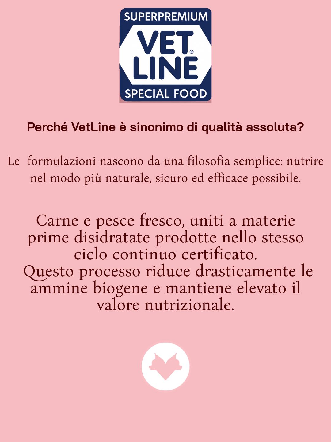 Le ricette VetLine sono studiate per rispettare la fisiologia del cane, con ingredienti selezionati e formulazioni bilanciate, perfette per l’alimentazione di tutti i giorni.